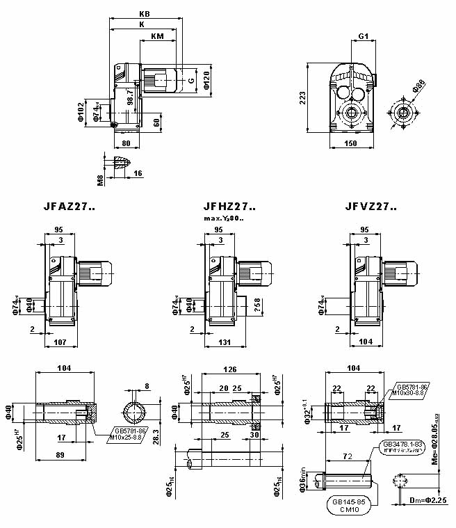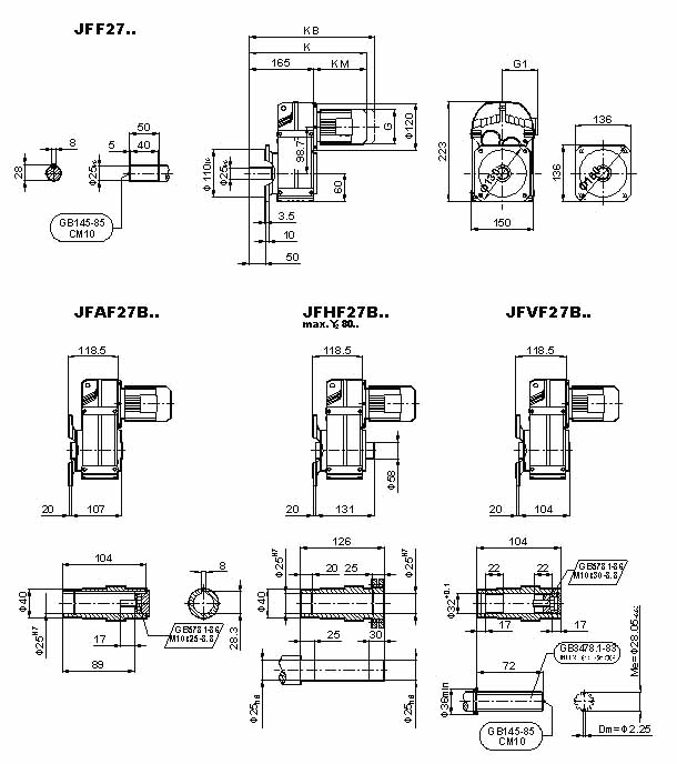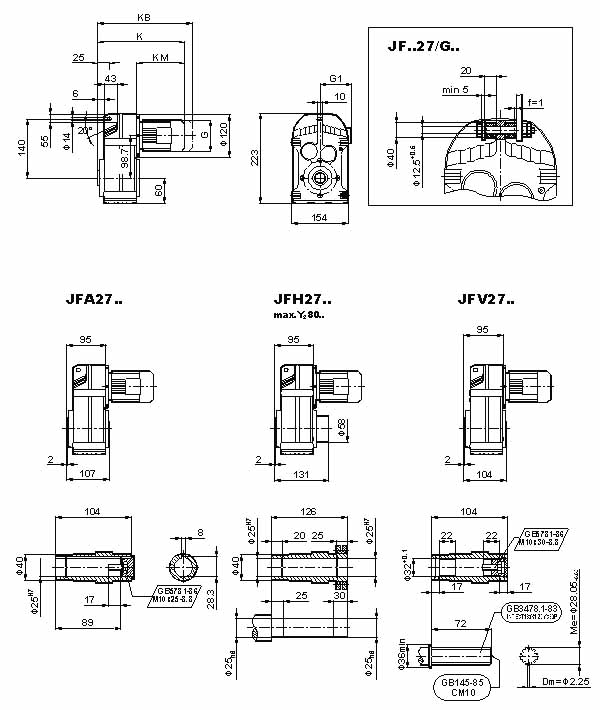 JF系列減速機外形安裝尺寸(JF27、JFA27B、JFH27B、JFV27B、JFF27、JFAF27B、JFHF27B、JFVF27B、JF..27/G、JFA27、JFH27、JFV27、JFAZ27、JFHZ27、JFVZ27)(GB10095-88) |