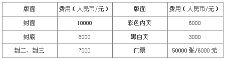 標準展位 國內企業:3M×3M 5200人民幣(主通道兩側加價20%) 國外企業:3M×3M 1800美元(主通道兩側加價20%) 標準展位配備: 三面展板、楣板、一張洽談桌、兩把折疊椅、兩只射燈、廢紙簍及5A 電源插座各一個。 室內光地 國內企業:500元/平方米 (不少于36平方米,主通道兩側加價20%) 國外企業 :180美元/平方米 (不少于36平方米,主通道兩側加價20%) 注:展臺特別裝修,特裝管理費由參展商自理 研討會及會刊廣告: