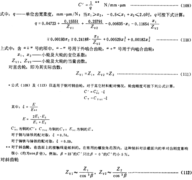 對基本齒廓符合GB1356-78,齒圈和輪輻剛性較大的外嚙合剛性齒輪,在中等載荷作用下時,其單對齒剛度可按下述公式近似計算*。