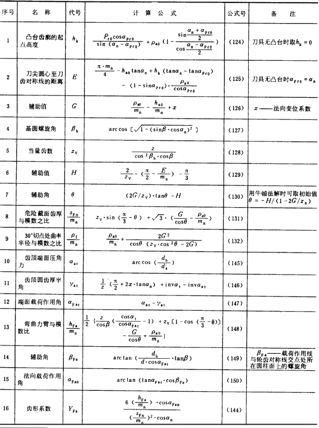 內齒輪的齒形系數YF不僅與齒數和變位系數有關,且與插齒刀的參數有關。為了簡化計算,可近似按替代齒條計算(見圖27)。替代齒條的法向齒廓與基本齒條相假,齒高與內齒輪相同,法向載荷作用角αFen等于αn,并以腳標2表示內齒輪。有關計算公式見表16(適用于Z2>70)。