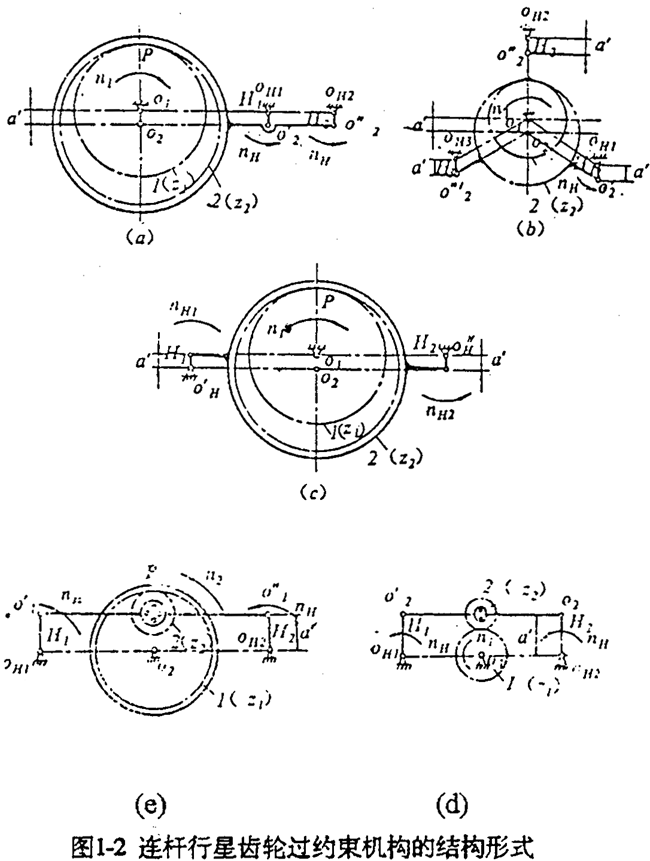 連桿行星齒輪傳動機構還有如圖1-2所示的各種形式。圖1-1和圖1-2(a)、(b)、(d)、(e)均為平行四邊形機構,圖1-2(e)為反平行四邊形機構。其中圖1-2(d)、(e)的連桿行星齒輪為外齒輪,其余均為內齒輪。