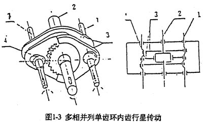 由于雙曲柄機構在曲柄旋轉一周要經過對稱的兩個“死點”位置,可以采用兩相(套)以上的并列雙曲柄機構以克服“死點”的不確定性。如三環減速器(見圖1-1),它是由相位差互為120°的三套平行雙曲柄機構組成的三相并列雙曲柄機構。當某一套雙曲柄機構位于“死點”位置時,另兩套雙曲柄機構通過支承高速軸傳遞扭矩推動其越過“死點”位置。這種結構的缺點是軸向尺寸大,中間齒板安裝比較困難,必須采用偏心套形式。高速軸上的鍵槽分度精度要求高。另外,三片行星齒輪,運轉過程中容易出現載荷分配不均的現象。采用這種原理克服“死點”的連桿行星齒輪傳動還有單齒環(見圖1-3)等減速器。
