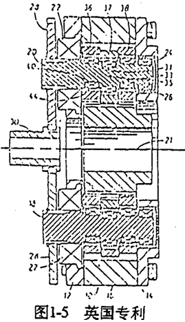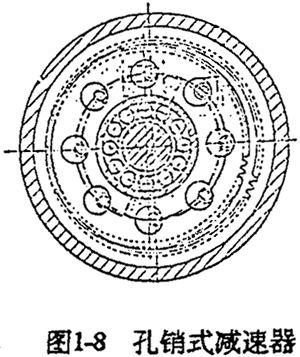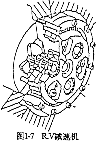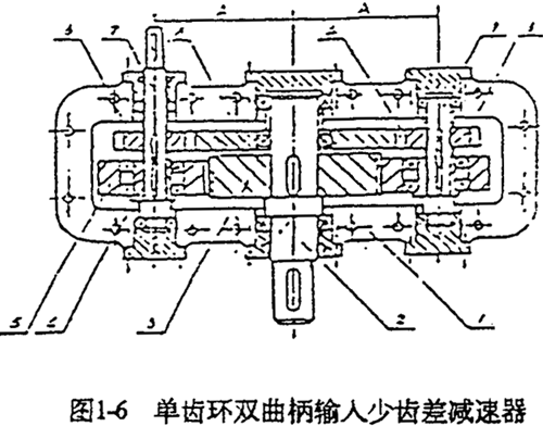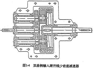雙曲柄機構中,如果在兩根曲軸上都有動力輸入,則“死點”位置也就自然不存在了。因此,可以通過一套定軸傳動機構把動力從一輸入高速軸傳遞到另一高速軸,從而克服機構“死點”。根據這種原理制成的雙曲柄輸入少齒差行星齒輪裝置之不理的類型很多,如太原工學院五十年代研制的雙曲柄輸入漸開線少齒差減速器(見圖1-4)、英國專利(見圖1-5)、、重慶鋼鐵公司研制的單齒環雙曲柄輸入少齒差減速器(見圖1-6)、日本松本和幸等人研制的RV減速器(見圖1-7)。其特點都是通過外嚙合齒輪副將輸入動力分流、傳遞到多個曲柄軸上,形式多軸輸入,從而克服“死點”。這種結構的特點是其傳動比為定軸傳動的傳動比與少齒差行星齒輪傳動的傳動比之乘積,因而可以通過改變外嚙合齒輪的齒數方便函地滿足不同傳動比的要求,適應性強。其不足之處是結構復雜,而且在高速軸之間存在兩平行傳動的剛性傳動鏈(外齒輪嚙合副和雙曲柄機構)對誤差比較敏感,加工精度要求很高。