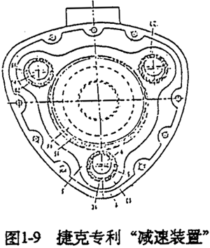 這種克服“死點”的方法是在連桿上布置兩個以上的曲柄,任意三個曲柄的旋轉中心不共線。這樣在同一平面上形成多個雙曲柄機構。當連桿行星齒板運動到某一曲柄機構的“死點”位置時,另外的雙曲柄機構不處于“死點”位置,可以傳遞動力和運動從而使行星齒板越過該閏置。常見的孔銷式少齒差行星齒輪減速器就是根據這一原理制成的(見圖1-8)。捷克專利“減速裝置(Rductor)”中利用了三曲柄軸機構作為少齒差行星齒輪傳動的輸入機構,三個曲柄軸構成120°均勻分布(見圖1-9)。這種結構的特點是實現單齒板傳動而無“死點”,但由于有兩個以上的曲柄軸,加工精度要求高。另外,結構比較復雜,安裝不太方便。催建昆博士提出的軸銷工落齒差行星齒輪傳動,通過兩偏心軸頸(曲柄)再加一個或兩個銷軸(相當于曲柄軸)構成的三曲柄機構來克服“死點”(見圖1-10),其特點是結構簡單,能實現單齒板傳動。