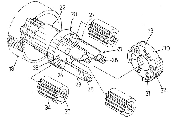 一種減速機自動導正機構,其是包括: 一本體,該本體一端形成為一開放端,且另端為封閉端,于該封閉端外周連設有一傳動齒輪,該本體的開放端端面上等分間隔有三個隔柱以及三個容置空間,且于三個隔柱朝開放端各凸設有一凸柱,該本體各于容置空間朝封閉端處凹設有一長槽; 三個容置于該容置空間的行星齒輪,該行星齒輪中央樞穿有一樞柱,而使該行星齒輪容置于該本體的容置空間內,且該樞柱的一端以容設于該本體的長槽內; 一封閉于該本體封閉端末端而呈環狀的封蓋,該封蓋于環面上設有三個穿孔,以供該本體的三個凸柱對應貫穿該穿孔,且抵頂于該本體的三個隔柱頂面,而該封蓋對應該行星齒輪的樞柱設有一長槽,使該等行星齒輪兩端凸出的樞柱各定位于封蓋及該本體的長槽間。
