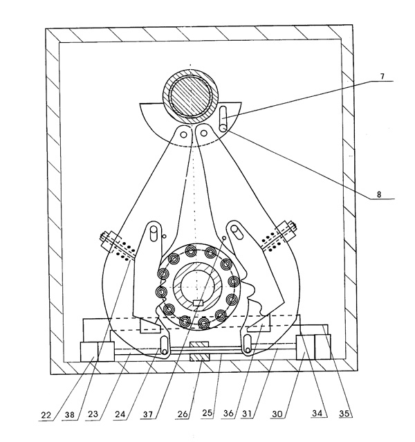 一種減速機(jī),其特征是輸入軸是偏心軸(2),偏心軸(2)中間偏心外圓上設(shè)置3-12個(gè)外套(32),每個(gè)外套(32)上分別連接連桿(27)位于殼體(1)內(nèi)一側(cè),每個(gè)連桿(27)連接能與滾輪(13)邊緣上的滾子輪(10)嚙合的鉤齒板(16);在工作時(shí)至少有1個(gè)鉤齒板(16)和對(duì)應(yīng)滾輪(13)邊緣上的滾子輪(10)嚙合,每個(gè)滾輪(13)邊緣上裝有5-80個(gè)滾子輪(10),上述所述的連桿(27)上裝有與滾輪(13)邊緣上的滾子輪(10)嚙合的鉤齒板(16)與對(duì)應(yīng)的3-12個(gè)滾輪(13)分別固定在輸出軸(12)上,且兩個(gè)相鄰滾輪邊緣上的滾子輪(10)在橫向排列上相位差是一個(gè)等值弧度,在連桿(27)上設(shè)置有定位槽(24),固定銷(21)設(shè)置在連桿(27)定位槽(24)內(nèi)位于殼體(1)內(nèi),鉤齒板(16)背面設(shè)置有彈性復(fù)位裝置。 |