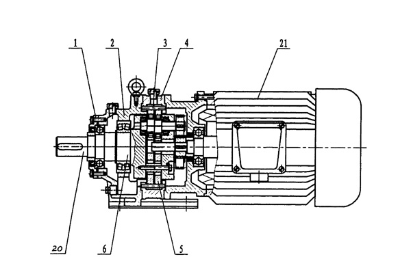 一種減速機,電機(21)與針齒殼(4)聯接,針齒殼(4)與機座(2)聯接,其特征在于,空心行星架裝置(6)通過軸承設于機座(2)內,并與裝在針齒殼(4)內的針齒銷(3)、擺線片(5)產生關聯,太陽輪(13)與電機(21)的電機軸(12)連接,輸出軸(20)和空心行星架(6)整合為一體延伸至機座(2)外。