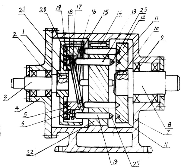 一種錐齒減速機,它主要由軸承(2)支承于端蓋(4)的輸入軸(3),由鍵(14)連接于機殼(7)內壁的錐齒盤(22)、由軸承(9)支承于機殼(7)的輸出軸(8)構成,位于機殼(7)內的輸入軸(3)的端部由鍵(1)連接有推壓盤(20),位于機殼(7)內的輸出軸(8)的端部由鍵(10)連接有錐孔盤(12),其特征在于推壓盤(20)的凹腔(21)內相對裝置有兩個分別配有一組滾子(16,18)、間隔環(15,17)的軸向斜盤激波器(6,5),在錐齒盤(22)上分別與兩個軸向斜盤激波器(5,6)相對應的兩個同心圓周上均布的通孔(23)內插有端部呈圓錐體形(25)的錐齒(13),錐孔盤(12)上相對應的圓周上均布有與錐齒(13)端部的圓錐體形(25)相適應的錐孔(11)。