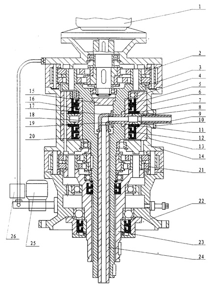 一種雙出軸噴液擺線減速機,其主要特征是在中間法蘭(14)中設有輸入接管(9),該輸入接管(9)與液體外套(8)聯接并通過管接頭(19)橫向進入中空的中間輸出軸(3)內,所述中空的中間輸出軸(3)與管彎頭(17)聯結后再與液體輸出管(24)接通。本實用新型應用在食品、飼料、化工等工業的雙螺旋、單螺旋混合機上,與現有的蝸輪,傘齒輪噴液減速機相比,重量減輕20~35%,壽命約增加60%,而且有效地降低了溫升和噪音。