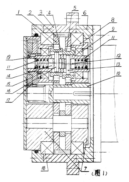 一種屬于曲柄擺線減速機或擺線減速機結構形式的工業機器人微回差減速機,其特征在于: (a)輸入軸[19]內有一通孔; (b)輸入軸[19]裝配偏心軸承[4]、[5]部位上分別加工出同旋向的二螺旋槽,每一處螺旋槽系旋轉180°對稱、同旋向二短槽,兩槽旋轉貫通,槽指向偏心軸承內孔鍵槽; (c)輸入軸[19]內孔有對應于螺旋槽的二只拉桿[14]與[12],在桿的徑向分別裝配銷[16]與[13],銷的一端置于一側螺旋槽中,另一端伸出另一側螺旋槽而與偏心軸承內孔鍵槽滑配,當拉桿移動時,拉桿隨其上的銷沿螺旋槽移動的同時并轉動,最終使二偏心軸承相對偏轉一小角; (d)拉桿[14]、[12]兩端分別有壓縮彈簧[11],彈簧初壓縮力使二偏心軸承相對偏轉一小角度而不再錯開180°。