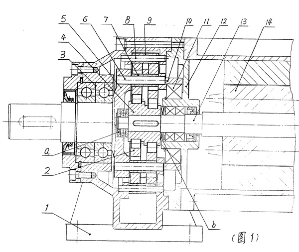 一種擺線減速機,主要由機座[1]、擺線輪[2]、軸承[3]、偏心軸承[4]、輸出軸[5]、柱銷[6]、柱套[7]、針銷[8]、針套[9]及針齒殼、輸入軸[13]構成,其主要特征在于:機座[1]內腔有兩條圓環壁M與N,圓環壁圓周上加工出均布的孔用以裝置針銷[8],從而形成機座與針齒殼二者融為一體的結構。