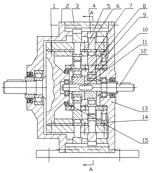 一種雙級內曲線減速機,包括輸入軸、端蓋、殼體、機座、輸出軸和減速機構,輸入軸通過支承軸承與端蓋連接,輸出軸通過另一套支承軸承與機座連接,所述端蓋、殼體、機座互相連接構成減速機外殼,所述減速機構由一級減速機構和二級減速機構組成,其特征為:一級減速機構是輸入軸上套裝有偏心套,偏心套上套裝有滾柱軸承,后者套有與所述端蓋固定連接的小傳動圈,所述滾柱軸承外圓可在小傳動圈內環槽中作偏心旋轉運動,沿小傳動圈外圓軸向開有等分導槽,其與小傳動圈內環槽形成通孔,各等分導槽通孔兩側裝有擋塊,各通孔中裝有可作徑向往復運動的小滾動體,小傳動圈外套有小內齒圈,小滾動體與滾柱軸承外圓和小內齒圈曲線形內圈接觸,在小傳動圈通孔中運動;二級減速機構為所述小內齒圈外圓套裝無內圈滾動軸承,所述殼體內孔固定裝有大內齒圈,無內圈滾動軸承和大內齒圈之間套有大傳動圈、與輸出軸固連,所述無內圈滾動軸承外圓可在大傳動圈內環槽中作偏心旋轉運動,沿大傳動圈外圓軸向開有等分導槽,其與大傳動圈內環槽形成通孔,各等分導槽通孔兩側裝有擋塊,各通孔中裝有可作徑向往復運動的大滾動體,其與無內圈滾動軸承外圓和大內齒圈曲線形內圈接觸,在大傳動圈通孔中運動。 |