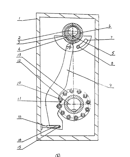一種減速機,包括輸入軸、主動輪、被動輪、輸出軸、殼體,其特征是上述所述的主動輪是有3至10個偏心輪(4)組成,每個偏心輪(4)內孔固定在所述的輸入軸(2)上,每個偏心輪(4)外園上設置外套(32),每個外套(32)上分別連接連桿(27)位于殼體(1)內一側,每個連桿(27)連接能與滾輪(13)邊緣上的滾子輪(10)嚙合的鉤齒板(16);在工作時至少有1個鉤齒板(16)和滾輪(13)邊緣上的滾子輪(10)嚙合,上述所述的被動輪是邊緣上裝有滾子輪(10)的滾輪(13)固定上輸出軸(12)上,滾輪(13)邊緣上滾子輪(10)的軸向排數大于或等于鉤齒板(16)數,在連桿(27)上設置有定位槽(24),固定銷(21)設置在連桿(27)定位槽(24)內位于殼體(1)內,或者每個連桿(27)上設有能與滾輪(13)邊緣上的滾子輪(10)嚙合的鏈齒(11),在工作時至少有1個鏈齒(11)和滾輪(13)邊緣上的滾子輪(10)嚙合,鉤齒板(16)背面設置有彈性復位裝置。 |