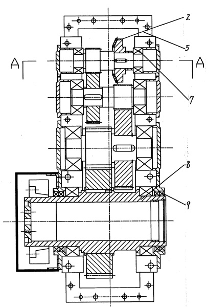 一種高油位自潤滑減速機,它有多級齒輪傳動,其特征在于,在高位的第一級傳動中采用相互垂直的錐齒輪與錐齒軸嚙合傳動,錐齒軸的另一端為輸入端,在錐齒軸的輸入端及末級傳動的輸出軸出軸處均采用雙油封密封,上述第一級傳動直接浸泡在潤滑油中,實現濺油潤滑方式。