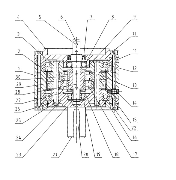 一種星輪減速機,包括輸入軸、輸出軸、齒輪、齒圈和通蓋,其特征是:減速機殼內裝有輸入軸、輸出軸、齒輪、齒圈,輸入軸裝有偏心套(18),輸入軸(5)有雙支撐軸承(8、19),偏心套裝有兩偏心軸承(17、30),兩偏心軸承(17、30)分別裝有齒輪(2、29),兩齒輪(2、29)外聯接齒圈(1),兩齒輪(2、29)由連接銷軸(13)固定于均載盤(3)和軸出軸(21),均載盤(3)設有軸承(12),輸出軸(21)外圓與通蓋(16)間裝有密封圈。