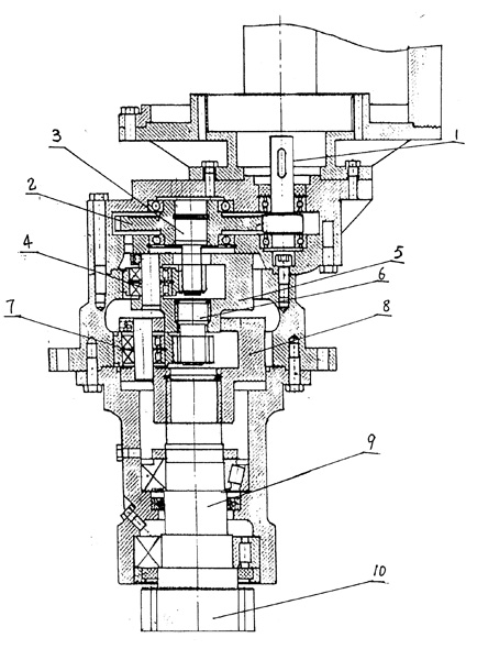 一種行星齒輪減速機,其由外嚙合齒輪裝置、二級行星減速裝置、輸出齒輪軸和傳動齒輪等部件構成,其特征在于二級行星減速裝置包括相同兩套行星齒輪裝置,每套行星齒輪裝置由傳動太陽輪、傳動行星輪和傳動行星支架構成,其中傳動太陽輪與三個傳動行星輪相嚙合,傳動行星輪與傳動行星支架的內齒圈相嚙合,二級傳動行星支架與三級傳動太陽輪之間通過內花鍵將兩套行星齒輪裝置連成一體,三級傳動行星架通過內花鍵與輸出齒輪軸連接。
