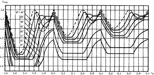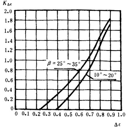 接觸跡系數(shù)是考慮重合度尾數(shù)Δε對(duì)輪齒應(yīng)力的影響系數(shù)。當(dāng)Δε較大時(shí),在相應(yīng)于Δε的齒寬部分,即使在最不利的情況下,也有部分接觸跡參與承擔(dān)載荷,使輪齒應(yīng)力有所下降。推薦Δε=(0.25~0.4)。KΔε值可按Δε由圖3查取。當(dāng)齒端修薄時(shí),應(yīng)根據(jù)減去齒端修薄長(zhǎng)度后的有效齒長(zhǎng)部分的Δε來(lái)查圖(當(dāng)20°<β°<25°時(shí),采用插值法查取)。