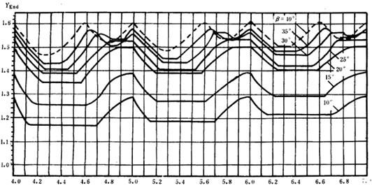 齒端系數(shù)是考慮接觸跡在齒輪端部時(shí),端面以外沒(méi)有齒根來(lái)參與承擔(dān)彎曲力矩,以致端部齒根應(yīng)力增大的影響系數(shù)。對(duì)于未修端的齒輪,YEnd值可根據(jù)εβ(εβ=b/Px)由圖8查取(當(dāng)β不是圖中值時(shí),用插值法查取)。