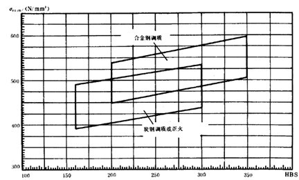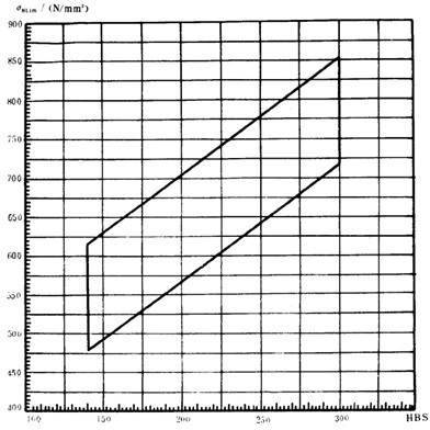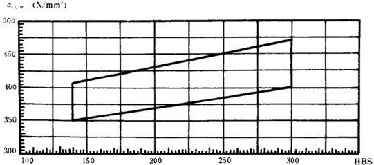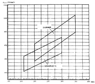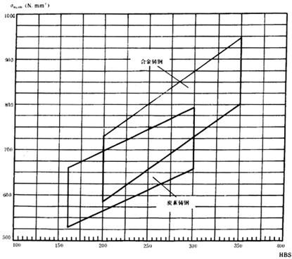 疲勞極限是指某種材料的齒輪經(jīng)長(zhǎng)期持續(xù)的重復(fù)載荷(接觸應(yīng)力循環(huán)基數(shù)No=5×107,彎曲應(yīng)力循環(huán)基數(shù)No=3×106)作用后,輪齒保持不破壞時(shí)的極限應(yīng)力。它可由齒輪的負(fù)荷動(dòng)轉(zhuǎn)試驗(yàn)或經(jīng)驗(yàn)統(tǒng)計(jì)數(shù)據(jù)獲得。當(dāng)缺乏資料時(shí),可參考圖10和圖11,根據(jù)材料和齒面硬度取值。鑄鋼、氮化鋼和球墨鑄鐵的疲勞極限見(jiàn)附錄A(補(bǔ)充件)。