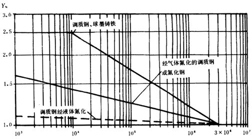 圖12當(dāng)調(diào)質(zhì)鋼和球墨鑄鐵的應(yīng)力循環(huán)次數(shù)NL或NV≥5×107時(shí),ZN=1;氮化鋼的應(yīng)力循環(huán)次數(shù)NL或NV≥2×106時(shí),ZN=1。圖13的應(yīng)力循環(huán)次數(shù)NL或NV≥3×106時(shí),YN=1。