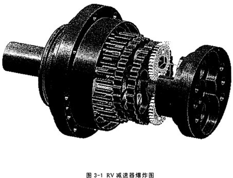 本課題研究的減速器型號為RV-6AⅡ,用于120kg點焊機器人上,其額定工況是輸入轉速1500r/min,負載為58N·m,下圖為利用UG生成的該型號RV減速器的爆炸圖,主要由齒輪軸、行星輪、曲柄軸、轉臂軸承、擺線輪、針輪、剛性盤及輸出盤等零部件組成。