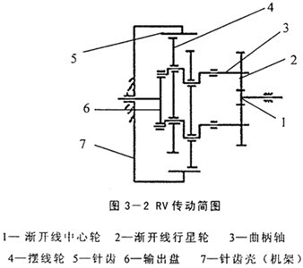 圖3-2是RV傳動簡圖。它由漸開線圓柱齒傳輸線行星減速機構和擺線針輪行星減速機構兩部分組成。漸開線行星齒輪3與曲柄軸2連成一體,作為擺線針輪傳動部分的輸入。如果漸開線中心齒輪1順時針方向旋轉,那么漸開線行星齒輪在公轉的同時還有逆時針方向自轉,并通過曲柄帶動擺線輪作偏心運動,此時擺線輪在其軸線公轉的同時,還將在針齒的作用下反向自轉,即順時針轉動。同時通過曲柄軸將擺線輪的轉動等速傳給輸出機構。