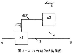 為計算RV傳動的傳動比,將上述的傳動簡圖用圖3-3所示的結構簡圖代替。該機構簡圖包括兩個簡單行星機構:x1和x2。輸出件A為中心輪1,輸出件B為輸出盤6,且有ω6=ω4。支承件E為針輪7,漸開線行星輪2與轉臂(曲柄軸)3均為輔助件d。