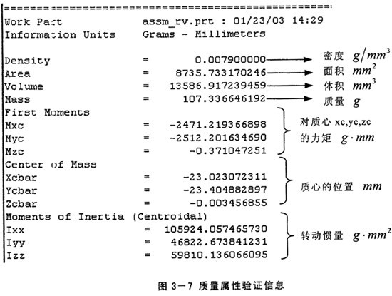 通過UG強大的質量屬性檢驗功能,可獲得每個零件及整個模型的密度、體積、質量和慣量等必要信息。上圖3-7是所獲得的擺線輪的相關信息。