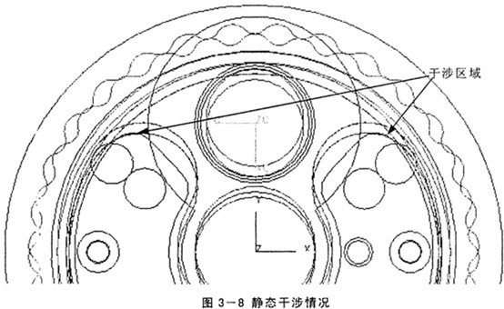 后三種都是實際結構可能存在的,當出現第一種干涉即硬干涉時就要引起高度重視,這可能是:設計存在問題,必須及時糾正。就是借助此功能,造型完成后,本人發現輸出盤與擺紅、輪間有硬干涉(見圖3-8),與設計此減速器的部門交換意見,原來他們在設計完后沒有發現此問題,等制造出成品后才發現,便通過手工磨削將干涉部分除去。此處也充分體現了與傳統的設計方法相比,虛擬樣機技術有著不可比擬的優越,即在制造第一臺物理樣機前就發現了機構在結構方面的缺陷。至于機構的優化和性能改進方面,通過后面的仿真分析更能清楚地展現虛擬樣機技術的優越。