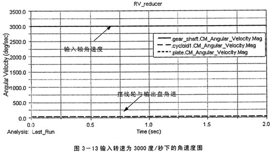 7=30,計算得到總的傳動比為103,而由仿真得到的傳動比在圖3-8中為i=3000/29.12=103.02,在圖3-9中為i=600/5.829=102.93,且圖中擺線輪與輸出盤的角速度相等說明輸出部分施加的約束滿足等角速度輸出原理。