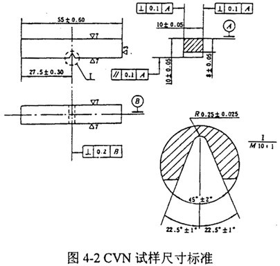 GB2106-80和ASMME23-96規定試樣標準尺寸為10×10×55mm,缺口深度為2mm。對于2/3尺寸試樣,厚度減為6.67mm,截面尺寸不變,如圖4-2。