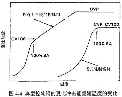 對于斷口上有分離的材料,隨溫度的升高,分離將最終消失,這是因為馬氏體和貝氏體帶也達到了上平臺溫度。圖4-4表示典型控軋鋼的夏比能量隨溫度的變化。夏比沖擊試樣上100%剪切面積對應的最小夏比能稱為CV100。當所有的分離都消失時,上平臺能CVP出現,其大小可能高于CV100。
