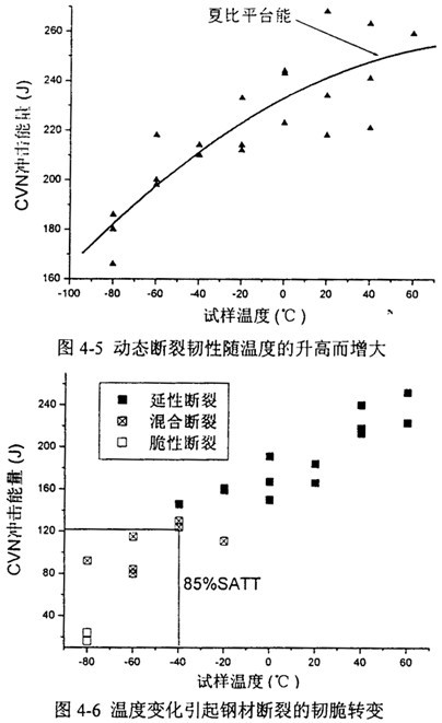表4-3給出了歸納的夏比沖擊能量值及85%剪切面積對應的轉變溫度。