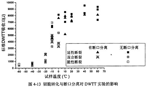 圖4-13比較了在延性和脆性斷裂中有無斷口分離試樣的DWTT韌性值。結論與CVN實驗類似,發生斷口分離的試樣,測得韌性值略低。