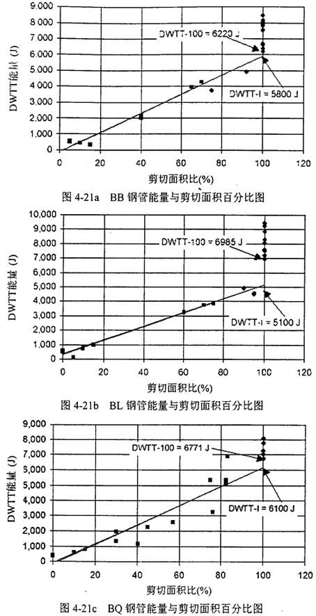 圖4-21a,b,c是能量與剪切面積百分比圖。和前面-樣,菱形實驗點表示剪切面積高于90%,方形表示低于90%。與對CVN數據的處理類似,分別定義DWTT-100表示100%剪切面積時最低的DWTT能,DWTT-I表示DWTT轉變能,DWTT-P表示DWTT平臺能。由圖4-21可確定DWTT和DWTT-100的值。