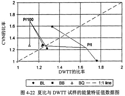 圖4-22是CVN與DWTT試樣的上臺能量特征值數據圖。總的來說,CVN與DWTT試樣的特征能量比率有較好的一致性。圖中P/100的符合性比P/I更好,很大程度上是因為CV100、DWTT-100比CVN-I、DWTT-I的獲得方法更為明確。