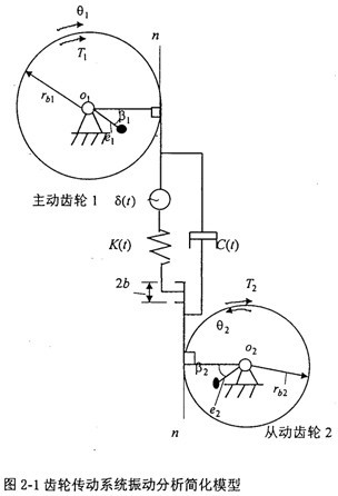 圖2-1中,rb1——主動齒輪基圓半徑;rb2——從動齒輪基圓半徑;K(t)——齒輪嚙合剛度;e1——主動齒偏心距;e2——從動齒輪偏心距;β1——主動齒輪不平衡質量的初始角度;β2——從動齒輪不平衡質量的初始角度;δ(t)——齒輪的綜合誤差;JD1——主動齒輪轉動慣量;JD2——從動齒輪轉動慣量;C(t)——齒輪阻尼系數;b——具側間隙;n-n——齒輪嚙合線方向。