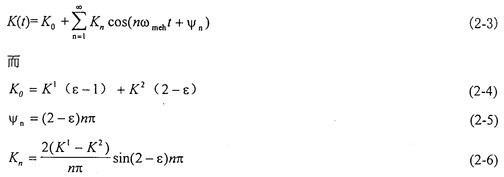 式中X=rb1tgθ1-rb2tgθ2為主、從動齒輪間的相對振動位移;K(t)為齒輪嚙合剛度,近似視為矩形波,可展為富氏級數: