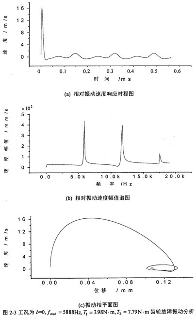 圖2-3是工況為:齒輪嚙合頻率為5888Hz、齒側間隙b=0齒輪故障振動分析,其中(a)圖為齒輪輪齒相對振動速度時程響應圖,(b)圖為齒輪輪齒相對振動速度幅值譜圖。從圖上可看出,當齒側間隙為0時,此時振動故障頻率為齒輪嚙合頻率fmeh。的1、2、3倍。相平面圖也穩定于一個橢園極限環(見(c)圖)。