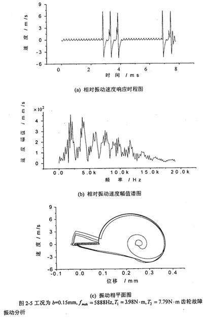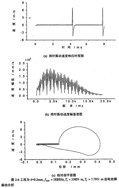 軸承對箱體動態激勵力和齒傳輸線相對振動位移X=(rb1tgθ1-rb2tgθ2)有相對振動速度 (=rb1sec2θ1 1)有關,文中只列出 的計算結果,圖2-3~圖2-13為各種工況的齒輪故障振動分析,其中包括齒輪輪齒相對振動速度時程響應圖、齒輪輪齒相對振動速度幅值譜圖和相平面圖。