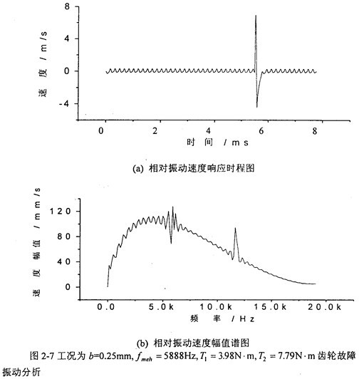 (齒厚)時,齒輪輪齒相對振動速度時程響應圖((a)圖)和齒輪輪齒相對振動速度幅值譜圖((b)圖)。從(b)圖上可看出,當齒側間隙增加到0.25mm時,此時振動故障頻率成份又發生了改變,振動故障頻率為齒輪嚙合頻率f