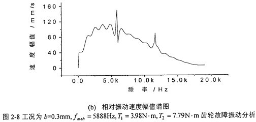 圖2-4(b)是輕載時(小的齒側間隙)齒輪輪齒相對振動速度幅值譜圖。從圖上可看出,此時振動故障頻率為齒輪嚙合頻率fmeh的1、2、3倍,無分數諧波成份出現。