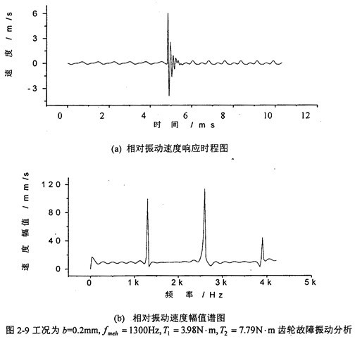 圖2-9是當齒輪嚙合頻率為1300Hz、齒側間隙b=0.2mm時,齒輪輪齒相對振動速度時程響應圖((a)圖)和齒輪輪齒相對振動速度幅值譜圖((b)圖)。從(b)圖上可看出,當齒側間隙為0.2mm時,此時振動故障頻率為齒輪嚙合頻率fmeh的1、2、3倍,分數諧波不明顯。