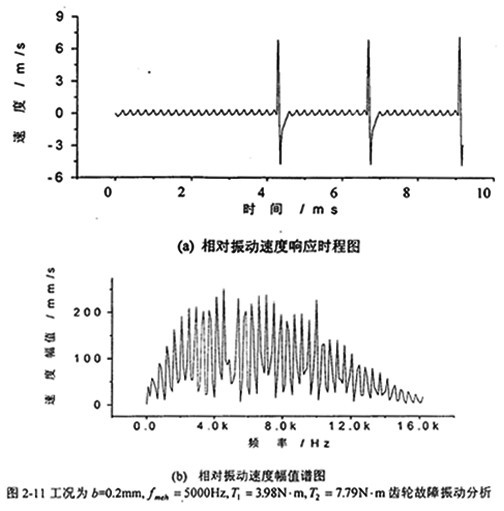 圖2-10中,(a)圖和(b)圖分別是當齒輪嚙合頻率增加到4000Hz、齒側間隙增加到b=0.2mm時齒輪輪齒相對振動速度時程響應圖和齒輪輪齒相對振動速度幅值譜圖。從(b)圖上可看出,此時振動故障頻率仍為齒輪嚙合頻率fmeh的1、2、3倍,分數諧波也不明顯,但2fmeh的幅值比1fmeh的大。