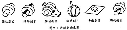 在等角速萬向聯軸器中,大部分都屬于連桿機構.最古老的雙聯十字軸萬向聯軸器機構就是球面四連桿機構。從大量的不同的機構綜合中,有可能得出多種實用的等角速連桿機構,所以研究等角速理論,以連桿機構的型式和尺度關系為對象,進行新的等角速理論的探索,在一定的意義上是可行的。在機構學上,構件同構件間的連接稱為副,其不同的形式和代號如圖2-1所示:
