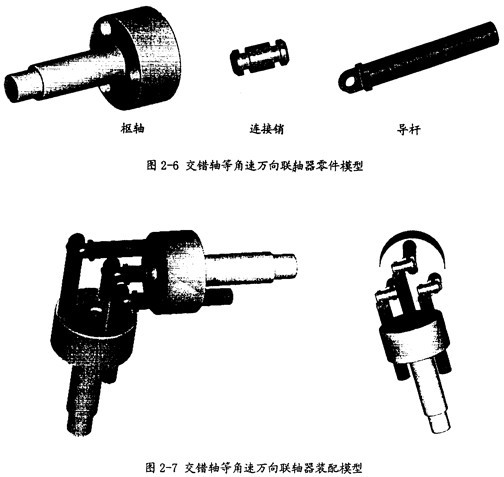 利用圖2-5中的機構形式,將其在空間中進行擴展,即可得到一種非常有價值的等角速萬向聯軸器——RCRCR交錯軸等角速萬向聯軸器。在圖2-6示意了此種聯軸器的組成零件模型,在圖2-7中示意了此種聯軸器的裝配模型,其中左右兩圖分別是從不同的視角得到的視圖。這種聯軸器在功能上能實現空間交錯軸傳動,它的主要特點是:低副結構,耐磨損性好;構件形狀簡單,便于制造;允許被聯接的兩交錯軸的偏移角變動范圍大,甚至可作直角交錯傳動(不考慮構件間干涉時)。