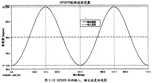 在此仿真中共輸出了此模型運動兩周的曲線,這證明此模型中雙曲柄肯定存在,按前面的理論,如果機構是鏡面機構,在輸入轉速恒定的情況下,則輸出轉速就是恒定的,在圖2-10中,在輸入轉速恒定為90°/s時,其輸出轉速是周期變化的。后來經模型修改,將原模型改為完全對稱結構,滿足鏡面機構的條件,重新進行仿真,得出的結果是輸入轉速同輸出轉速完全相等。這從正反兩面說明了前面理論的正確性,同時也說明要想得到等角速傳動并不是一件簡單的事。不過本次證明只是對一種形式機構而言,有關其它的機構形式,還需要進一步的探索。