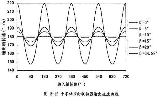 十字軸萬向聯軸器的基本結構如圖2-11所示,它是由兩個在軸上的叉形接頭1、2和一個十字軸組成,因為叉形接頭和十字軸是鉸接的,因此允許被聯接兩軸有較大的角偏斜,但兩軸不在同一軸線上時,主動軸等速運動,從動軸將在某一范圍內作周期的變速運動,即兩軸不同步。