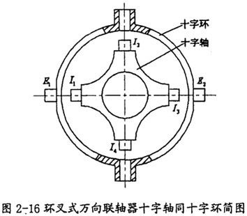 環叉式萬向聯軸器是在雙聯式萬向聯軸器的基礎上發展而成的。取消中間軸,使其兩端的十字軸在幾何上重合為一個率面,從而保證了理論上的等速傳動。為避免兩十字軸重疊時,軸實體發生干涉,將其中一個十字軸實體改為虛體一一變形為一個中空的圓環,稱為“十字環”。十字環上開有兩對中心線互相垂直的銷孔和短銷軸,實質上構成虛體十字軸,同樣起十字軸作用,使虛體和實體兩個十字軸在幾何上能重疊為一個平面。由于萬向聯軸器具有“環”和“叉”的結構特征,“環叉式萬向聯軸器”由此得名。