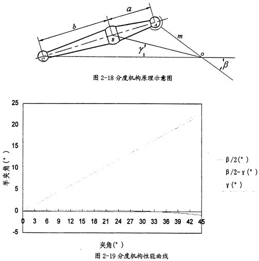 ,y的函數圖形,在β角小于36度以前,幾乎是重疊的,在36度以后,才開始有明顯的差異,這一點從它們的差值曲線(圖2-19中下面的紫紅色曲線)也可以看出。這就是說,此機構在目前的尺度下在36度以前,它的分度性能是相當理想的,值得借鑒。不過從分度性能曲線上,可以看出,環叉式萬向聯軸器并非是完全的等角速萬向聯軸器,因為在36度以前的分度也有微小的差異。